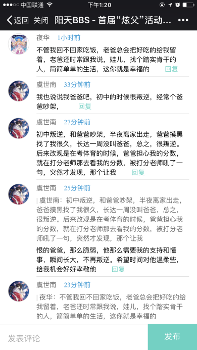 在今年的父親節(jié)中,我們還在世紀(jì)陽天BBS中發(fā)起了“炫父”跟帖活動,鼓勵小伙伴們積極踴躍的與大家共同分享自己與父親之間難忘的故事,不少同事的留言,讓人淚目。與父親的感人事跡歷歷在目,讓人不禁感嘆,歲月的無情與飛逝。
